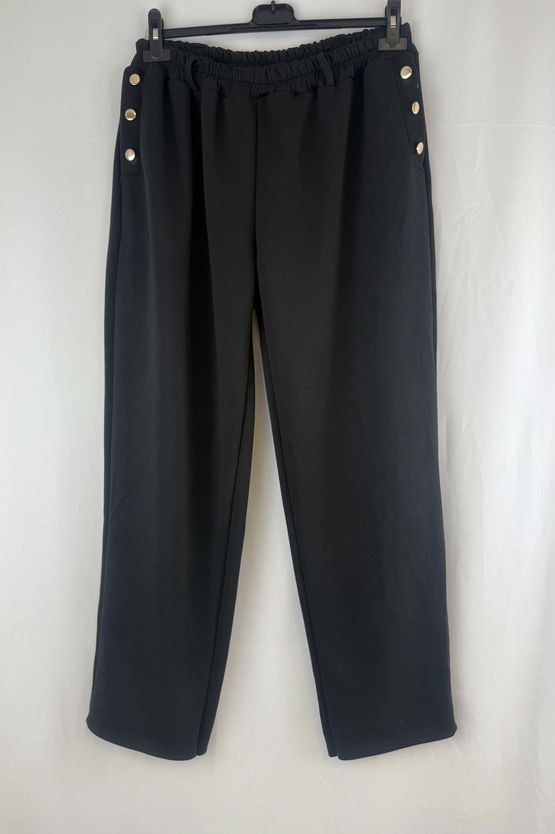 • soepele rechte tricot broek met gouden knopen op de zakken en lusjes voor een riem