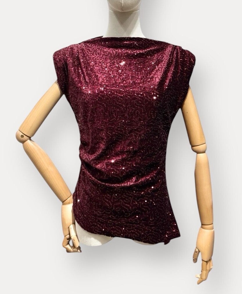 Deze elegante asymmetrische fluwelen top is afgewerkt met pailletten en heeft schouderpads voor een luxueuze touch. Perfect te combineren met een rok of pantalon. Ideaal voor feestdagen, events en stijlvolle avonden.