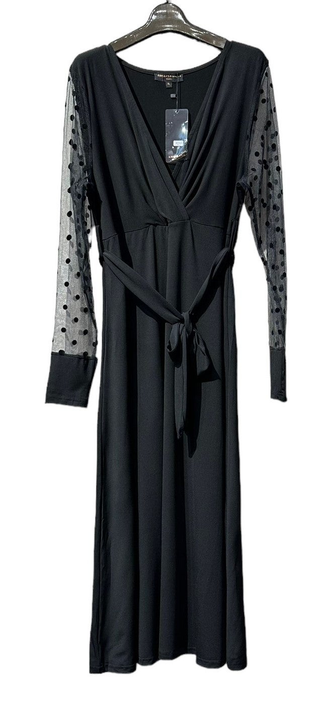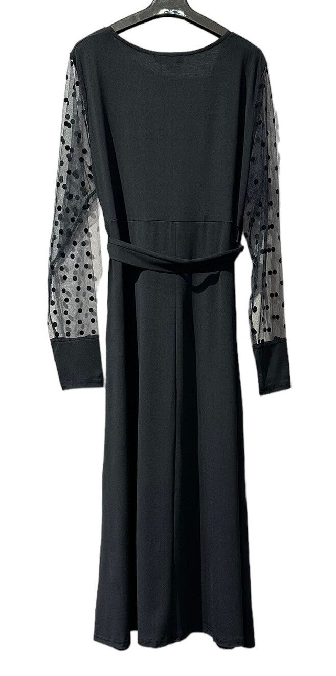 Deze elegante lange jersey jurk met mesh mouwen is perfect voor feestelijke momenten en speciale gelegenheden. De soepelvallende stof zorgt voor een flatterende pasvorm en draagcomfort, terwijl de transparante mouwen een luxe en vrouwelijke touch geven. Inclusief een striklint voor de taille.