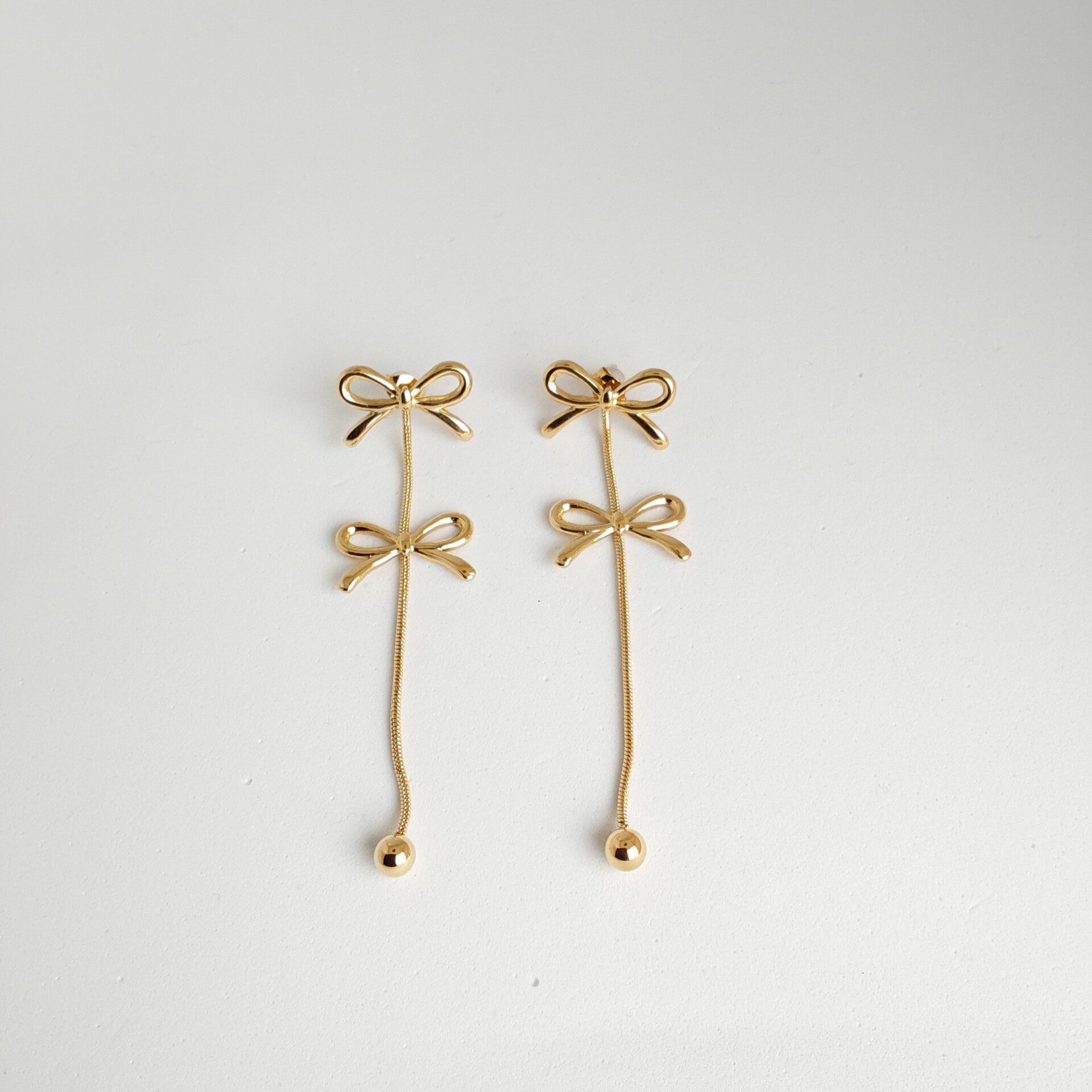 Elegante goudkleurige oorbellen met dubbele strikdetails en een verfijnd hangend kettingkje - sierlijk, speels en perfect om elke look te verfijnen.