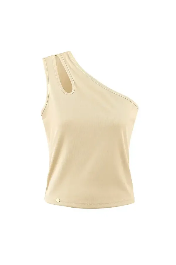 Huidskleurige one shoulder top met open detail op rechterschouder.